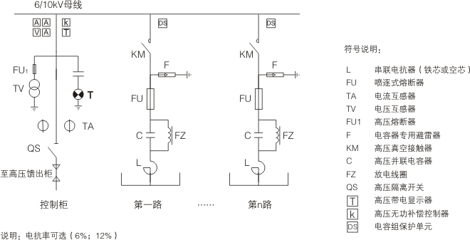 DEHVC型高壓智能無功補償裝置應(yīng)用傳統(tǒng)的投切電容器方式向系統(tǒng)中注入容性電流,補償無功功率,調(diào)節(jié)功率因數(shù)。其核心器件主要有控制器、高壓真空接觸器、電容器、電抗器及保護裝置等構(gòu)成。控制系統(tǒng)對系統(tǒng)電壓、電流信號進行采樣及分析處理,以功率因數(shù)及系統(tǒng)電壓為控制參數(shù)判斷并輸出控制指令,控制接觸器動作實現(xiàn)對電容器組的投切,使系統(tǒng)功率因數(shù)控制在設(shè)定范圍內(nèi)。